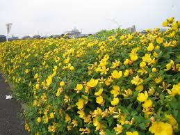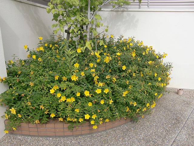 学校の顔 入口庭にキンシバイを植えました。