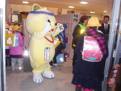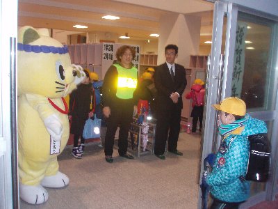 新学期2日目、早朝からかほく市ゆるキャラ「にやんたろう」が高小のあいさつ運動に飛び入り参加してくれました。連れてきて下さったのはPTA竹中会長、竹田副会長さんです。児童玄関前で、玄関のホールで子どもたちに元気を振りまいてくれました。にゃんたろうはしゃべらないので?PTAの方々と今日の挨拶担当クラス5年1組が全校の子どもたちに大きな声のあいさつをしていました。