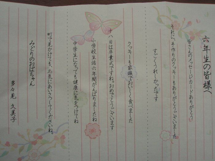 先週、長い間子どもたちの登下校を見守って下さった方々に、6年生がお礼の手紙を渡したことをこのホームページに載せましたが、返事の手紙をいただきました。