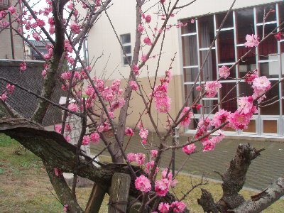 校地にある紅梅の古木が見事な花をつけました。