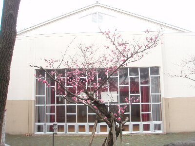 ちょうど体育館のステージの背景となる場所です。ひょっとしたら入学式に間に合うかも。どうぞ散歩がてら高小の梅の花を見においで下さい。