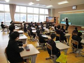 6年生の総合的な学習において、キャリア教育の一環として、実際にお仕事をされている方から直接学ぶ機会を設定しました。今日は、手作りケーキのお店「HAPPY」のオーナーの森田さん、沢野建設工房の若手大工の片山さんにお越しいただき、お話を伺いました。森田さんは、お菓子作りが自分の人生そのもので、好きだからこそできるというお話を聞かせてくださいました。また、片山さんは、以前はそんなにやりたいと思う仕事はなかったが、今は会社で一から家造りを学ぶことができ、誇りをもって仕事をしているというお話をしてくださいました。お二人の貴重な話を通して、児童は、自分の将来について考えながら熱心にメモを取っていました。森田さん、片山さん、本当にありがとうございました。