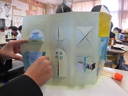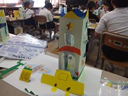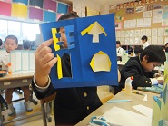写真は、2年生の図工「まどをひらいて」の作品と3年生の理科「風のはたらき・ゴムのはたらき」の車を使った実験の様子です。