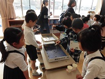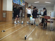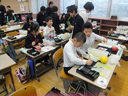 今回は、市の依頼で地元IT企業であるPFUから講師を招いて、シールプログラミングに挑戦しました。車型ロボットにあらかじめ指示を記憶させて、買い物のルートを条件通り正しく回るようにするものです。誤った指示を記憶させると、ルートを外れてしまい考え直さなくてはなりません。児童は、試行錯誤を繰り返しながら次第に指示通り動かせるようになっていきました。