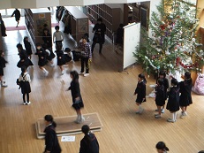 12月に入り、今年も地域の方の協力で大きなクリスマスツリーを飾ることができました。毎日、子ども達は、灯りがついたツリーの横で、縄跳びの新技に挑戦しています。図書館でも、ハートフルな本を読んだ子どもたちの記録とクリスマスの掲示がされています。