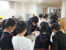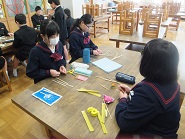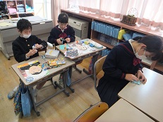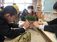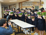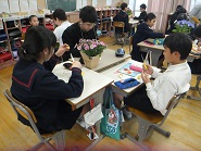 フラワーデザイナーの西田さんの指導のもと、水引、リボン、花を組み合わせ、のり付けしていきました。6年生は、学年美化部のみなさんにも教えていただきながら、自分なりのコサージュを完成させ、嬉しそうに袋にしまいました。来る卒業まで大切に保管されることになります。