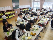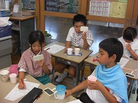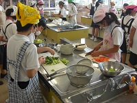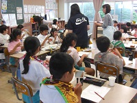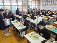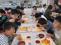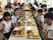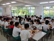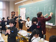 収穫とご指導に感謝し、児童は、野菜を使ったピザと生サラダを準備し、食べていただきました。先生方からは、「とてもおいしかったです。毎日水やりをがんばりましたね。」と温かいお言葉がありました。最後には感謝状と今月の歌のプレゼントで締めくくりました。