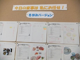 6年生は、この冬休みも、一日アイロンがけや料理などのいろいろな家事に挑戦しました。
