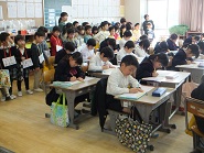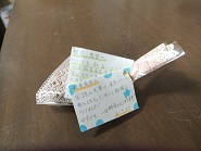宇部先生のお話を聞き、6年児童は平和の大切さについて感想を述べていました。また、学習後、鶴彬さんの姪にあたる城戸さんのご厚意で、着物をリサイクルし、代表的な川柳をプリントした手作りのティッシュケースをいただきました。心温まる学習会となりました。宇部先生、鶴彬を顕彰する会の皆様、どうもありがとうございました。