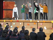 はじめに、保健委員会の児童(5,6年生)による劇「セロトニンマンVSよふかしマン」を上演し、その後、養護教諭が早寝・早起きが大切な理由を説明しました。