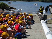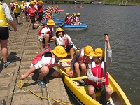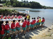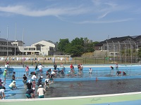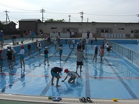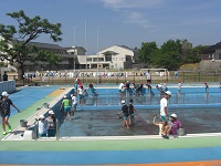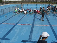 続いて、準備運動を行い、模範泳法を披露してもらった後に一斉に入水しました。児童は大きな歓声をあげながら水の感触を楽しんでいました。