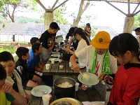 2年生が育ててきた夏野菜の収穫をお祝いする会「野菜パーティー」が開かれました。これまで畑の土作りからずっとご指導をいただいた畑の先生である、駒井先生、森先生、学校コーディネーターの楠先生ご招待しました。
