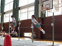 跳び箱、マット、鉄棒の3種目に分かれ、全員で元気な挨拶をしてそれぞれの演技を披露しました。どの児童も日頃の練習を生かし、精一杯の技を表現することができました。演技後は、やり切った満足感から来る笑顔が光っていました。