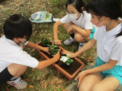 昨日、かほく市の人権擁護員のみなさんに来校いただき、人権教室と、人権の花贈呈式を行いました。今日は、その花を5年生がプランターに植えました。花を育てることを通して、優しい心を育ててほしいと願っています。