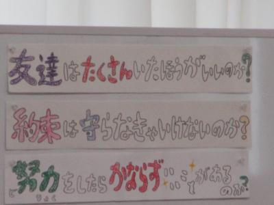 哲学館の職員の方々の指導で哲学的対話教師が行われました。ウォーミングアップの課題「子供と大人ではどちらが自由か」では、どちらの意見も出されましたが、子どもたちの意見を聞きながら、学校でも家庭でもいろいろな決まりがあり、昔と比べて、自由な行動が制限されていることに改めて気づかされました。参観していた大人もいろいろ考えさせられた会でした。