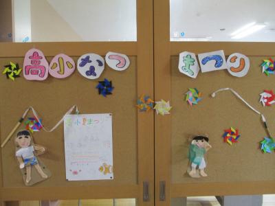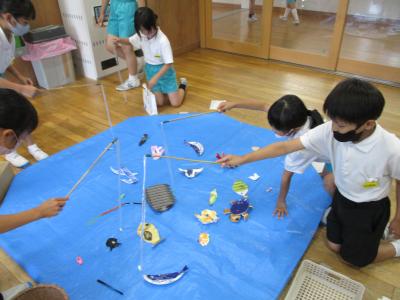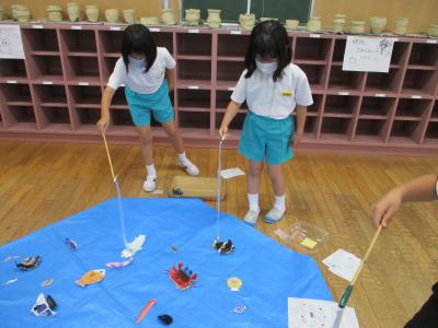 暑い日が続き、熱中症予防のため、外遊びができない日が多くなっています。そんな学校生活に少しでも楽しい時間を提供できたらと、6年生の有志と学校コーディネーター、学校サポーターが「高小なつまつり」を企画しました。今日はその初日に2年1組の子どもたちが招かれ、魚釣りやペットボトルタワーを楽しみました。企画してくれたみなさんに感謝です。