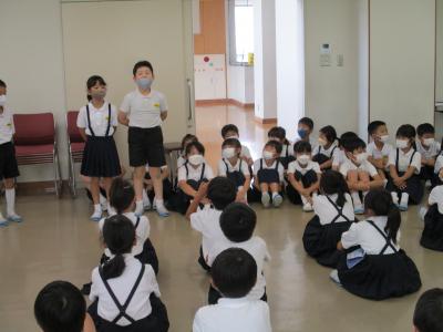 今日は石川県に熱中症アラートが発表されたため、午前中から外遊びを含む校外活動を中止しました。そのような中、室内の涼しい場所で、縦割り班による「なかよし遊び」が行われました。各班の6年生が企画運営し、みんなで楽しい一時を過ごしました。