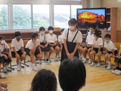 2年生が畑の先生である駒井先生をお招きしてお礼の会を開きました。今まで育ててきたキュウリやピーマン、ナスビ、エダマメについてその育ちを発表したり、それらの野菜に関するクイズを出したりと、自分たちが学んだことを生かして発表することができました。また、代表が駒井先生にお礼の言葉を述べたり、それぞれが書いた感謝の手紙を綴ったプレゼントをお渡しするなど、感謝の気持ちをしっかり伝えることができました。野菜の栽培や、畑の先生との交流を通して、また一段と成長できた2年生でした。