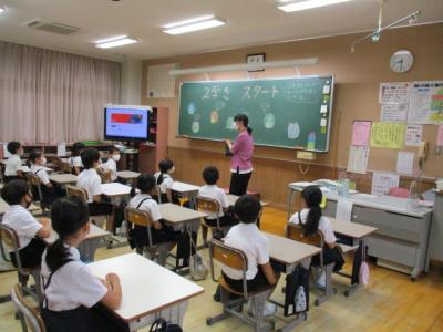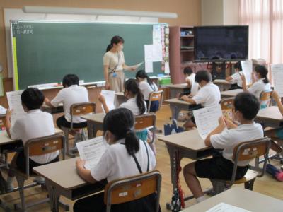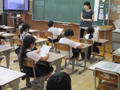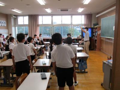 今日から2学期がスタートしました。子どもたちは大雨の中でも元気に登校してきました。始業式は感染予防のため、放送室からの映像を各教室で見ながら行われました。学校長からは、「行事を通して自分を成長させるために、めあてとふり返りを大切にしよう」という話がありました。その後、各教室では夏休みの課題や提出物の点検、夏休みの思いで紹介、後期の教科書の配布、2学期の係決め等が行われていました。6年生は9月23日の運動会に向けてダンスや応援の練習をスタートさせました。コロナ関係で欠席している児童もいますが、2学期も感染予防に努めながら、教育活動を進めて参ります。