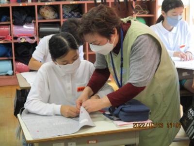 6年生は家庭科でナップザック作りを行いました。地域の生活学校の方々にお手伝いをお願いし、一人一人の子どもたちに支援をして頂きました。5年生で習った玉結びができない児童も多く、丁寧に教えて頂きました。