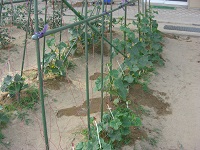 茎が伸びて支えが必要になったため、「畑の先生」である駒井先生が支え棒やネット張りを指導してくださいました。