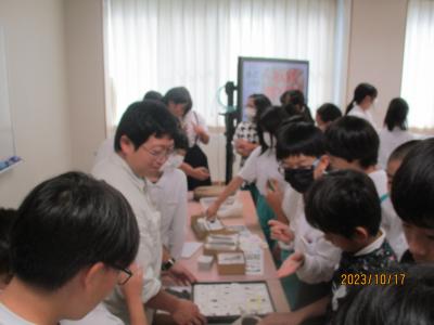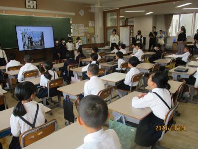 5年生が西田幾多郎哲学館の職員の方々による哲学対話教室を行いました。「この部屋に大人は何人いる?」「大人と子どもの違いは?」などの質問に子ども達は意欲的に答えていきました。次に、2つのグループに分かれて対話しました。1つのグループは「大人ってえらいの?」という問いでした。最初は「子どもにはゲームの時間を制限するのに、自分は好きなだけやっている。ずるい!」「大人が戦争を行い、多くの死者をだしている」といった否定的な意見が多く出されました。そこで「えらいとこはないの?」と問いかけられると「自分たちの将来のことを思って叱ってくれる」「働いて子どもを育ててくれる」と言った肯定的な意見も出されました。さらに「えらいと思う大人は?」との問いに対して「親」「ワクチンを作った人」「戦争から赤ちゃんを守っている人」などが挙げられました。全員が45分間、よく考え対話することができました。