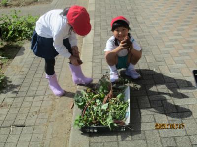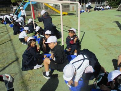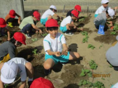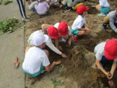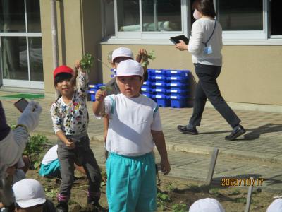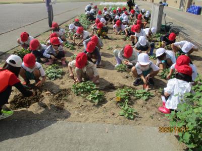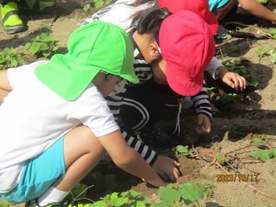 1年生は畑の先生、駒井先生にお世話して頂いたサツマイモの収穫を行いました。今年の夏は例年以上に暑さが厳しく、サツマイモの生長が思わしくありませんでしたが、1年生はみんなと協力しながら、一生懸命に土を掘っていました。サツマイモを掘り起こしたときは、喜びいっぱいの笑顔でサツマイモを見せてくれました。