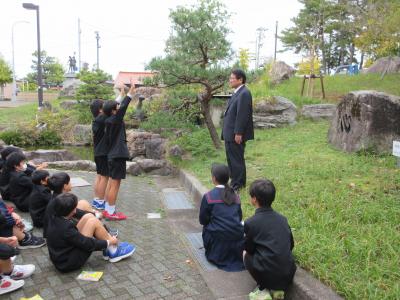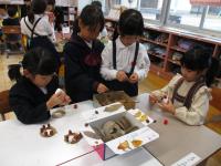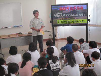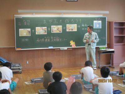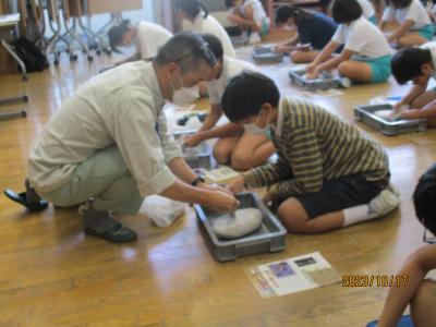 今日は朝から市生涯学習課のみなさんのお世話で、1学期作製した土器の野焼きを行いました。その後、県埋蔵文化センターの職員の方々による出前教室が行われ、縄文時代の暮らしについてお話を聞いたり体験したりしました。勾玉作りでは、比較的柔らかい石を使って形を整えていきましたが、それでも角を丸くするのにかなりの時間がかかり、当時の苦労を実感することができました。黒曜石を使って紙を切る体験では、思いの外よく切れることに驚き、自然物を上手に暮らしに生かしていたことに気付きました。体験を通して今までの学びをより深めることができました。
