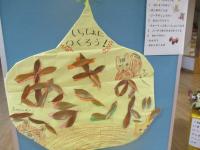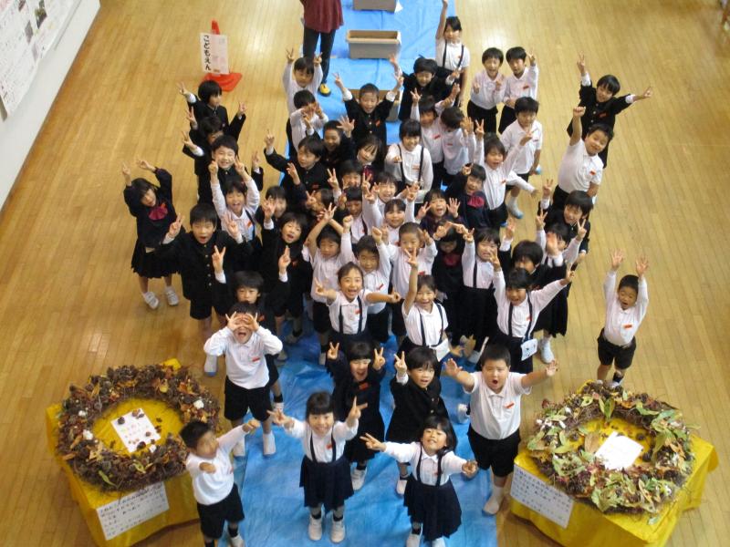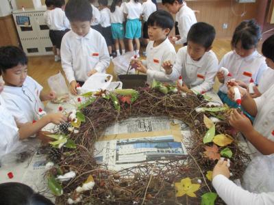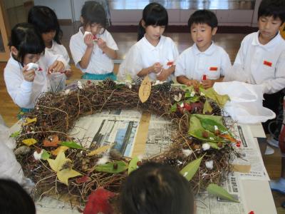 1年生が巨大なリースを作りました。生活科で栽培したサツマイモの蔓を材料にスクールサポートスタッフの栗林さんが大きな輪を作ってくれました。そこに、子どもたちが集めてきた色づいた落ち葉や、ドングリ、マツボックリなど、秋を感じさせられる物を飾りました。秋満載のすてきなリースが完成しました。