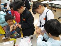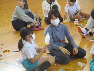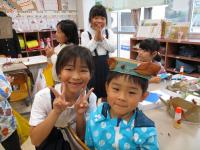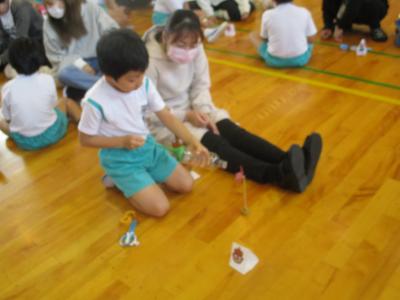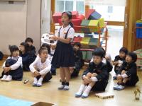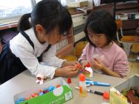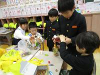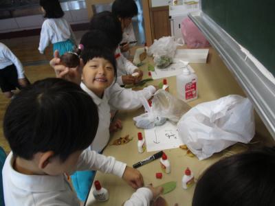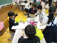 1年生が年長さんをお迎えして「あきのランド」を行いました。代表があいさつした後、各ブースの紹介をしました。実際に作るものを見せながら、大きな声で分かりやすく紹介していました。その後、年長さんとの思い出づくりとして、プランターにチューリップの球根を植えました。年長さんが入学してくる来年の春には、きれいな花を咲かせて迎えてくれると思います。その後、各ブースに分かれて、リースやアクセサリー、楽器におもちゃなど秋のものを使って一緒に物作りをしました。1年生は年長さんに優しく話しかけたり、上手にお手本を見せたりしながら活動できました。