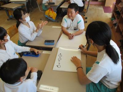 4年生がPFUの楯岡さんと久保石さんからプログラミングについて学びました。最初にプログラミングとは何かを簡単に教えて頂きました。自分たちの身の回りにある多くの電子機器がプログラムによって動いていることを知りました。次に、実際にプログラミングを体験しました。ダイオードを点滅させたり、ロボットを動かしたりしました。特にロボットを思い通りに動かすための時間調整が難しく、グループで結果を共有しながら何度も挑戦し、思い通りに動いたときはとてもうれしそうでした。