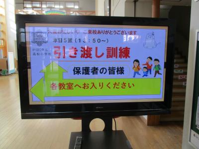 午後からは引き渡し訓練を行いました。昨年は全校児童が体育館に集まっての引き渡しでしたが、暑い日や寒い日を想定すると、体育館で長時間児童を待たせるのは難しいのではないかと考え、各クラスで引き渡しを行いました。兄弟が多い保護者の方は、教室を何カ所も回ることになりますが、今後ともみなさまのご協力をお願いします。