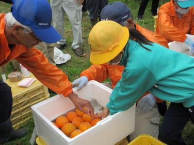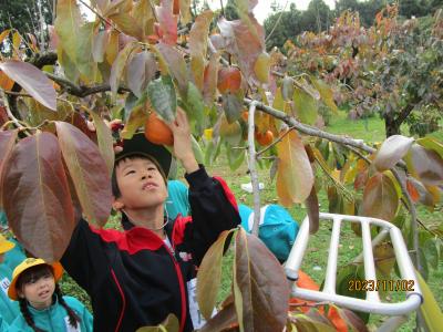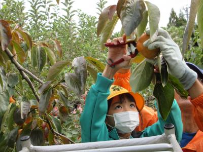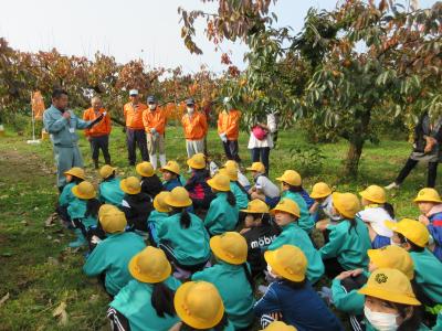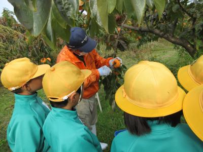 高松紋平柿生産組合のみなさんのお世話で、3年生が紋平柿の収穫体験を行いました。最初に紋平柿についてや収穫時の注意点などのお話を聞いた後、実際にハサミを使って収穫しました。実を傷つけないように丁寧にはさみを入れる子、高いところの柿をハシゴに登って採る子など、どの子も真剣な表情で収穫していました。それぞれが収穫した柿は発泡スチロールの箱にきれいに並べ、渋抜き用のアルコールを入れ、ガムテープでしっかり密閉しました。渋が抜けて甘くなるのが楽しみです。また、すでに渋抜きされた柿を全員が1個もらい、大事に学校に持ち帰ってきました。家に帰って、家族で甘い柿の味を楽しむのでしょうね。