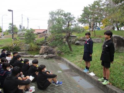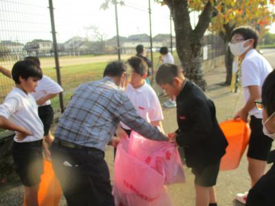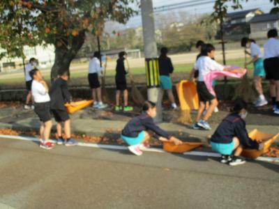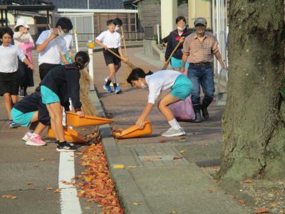 通学路である校庭横の歩道を、地域の老人会の方々が掃除して下さっています。今日は、その老人会の方々と環境委員会の子どもたちとで落ち葉清掃を行いました。赤や黄色に色づいた桜の葉が、歩道や車道に沢山積もっていました。風が強く、落ち葉が飛ばされることもありましたが、みんなで協力し、きれいなりました。最後に、老人会の方々に感謝の気持ちを伝えました。ありがとうございました。