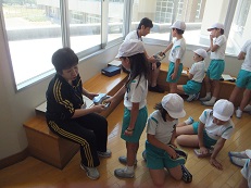 運動場や花壇の植物、池のめだかやおたまじゃくしなど、学校のいろいろな場所を一生懸命調べていました。