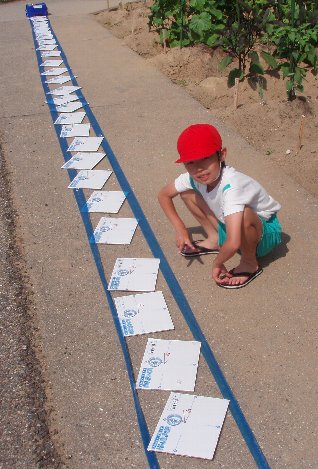 先週は3年生が地図広場で太陽の動きとかげの長さを学習していましたが、今日は4年生が理科の学習をしていました。太陽光を電気に変えてソーラーカーを走らせていました。梅雨の最中なのに雲一つ無い青空の下、子どもたちの車は勢いよく走っていました。