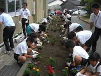 学校玄関前の花壇に花の苗を植えました。花壇も衣替えです。並べ方は児童がデザインしたものです。