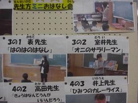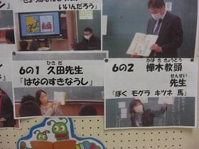 延期になっていたミニお話会をようやく実施しました。朝学習の時間に、職員がやってきて読み聞かせを行う企画です。児童はどの先生が読んでくれるのかを知らないので、驚きの声も上がります。その後、静かにお話の声に聴き入っていました。最後に「ありがとうございました」の声が響いていました。普段接することの少ない先生と時間を過ごすのもいいものです。