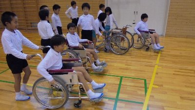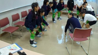 今日は、はるばる石川県リハビリテーションセンターから片田さんと山岡さんにお越しいただいて4年生が福祉について体験学習をしました。