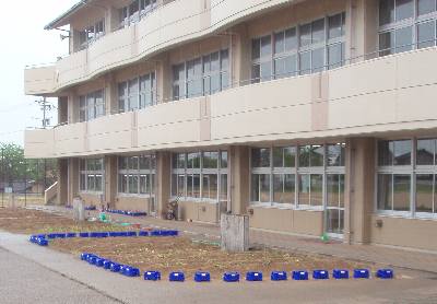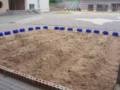 先日、1年生が教室を出たらすぐ外にある畑にさつまいものなえを植えました。でも雨が降っていないので砂地でカラカラ。