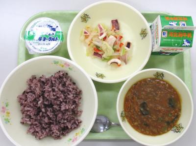 黒米ごはん 豚輝と小松菜のキーマカレー 能登いかのマリネサラダ 河北潟ヨーグルト 牛乳