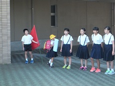 9月1日~15日まで、赤組白組それぞれの旗を持ってあいさつ運動に参加します。