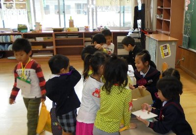 松ぼっくりのボーリング、どんぐりのこま、ひっつきむしのまとあて、などなどいっぱいの工夫がありました。歌も大きな声で歌えたし、がんばったね、1年生。年長さんもとってもおりこうさんでした。