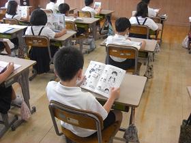今朝の朝学習は、全校一斉に読書です。朝のうちに本を借りてきて、教室で静かに10分間読書をしています。思い思いに本に向かっている姿を見ていると、集中力を養うのにもいいかもしれないと感じます。2年生の教室もしーんとした状態でした。たくさん本を読んでくださいね。今日は、3年1組で図書館の能澤司書が読み聞かせを行いました。