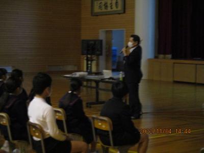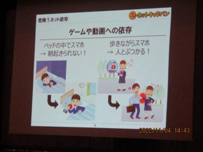 KDDIの細川一仁氏を講師としてお招きし、高学年及び保護者を対象にした非行被害防止講座が行われました。ネット依存、ネットいじめ、誘い出し・なりすまし、個人情報漏洩など実際にあった危険な事例をもとにお話をして下さいました。子どもたちは真剣な表情で聞いていました。今日、学んだことをぜひ家族で話し合い、このような被害に遭わないように取り組んでいただければと思います。