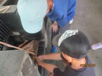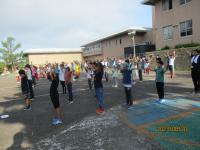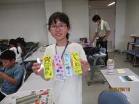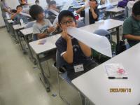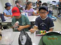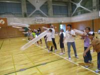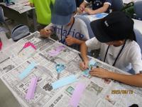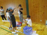 昼食後は、気温が高かったため、室内での工作にしました。最初に傘袋を使ったロケットづくりを行いました。出来るだけ遠くまで飛ぶように、ゴムの位置や、羽の付け方など試行錯誤しながら作りました。