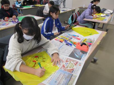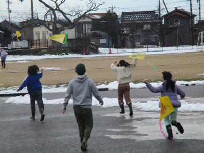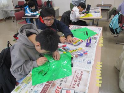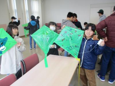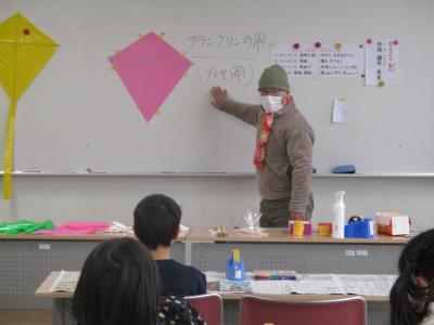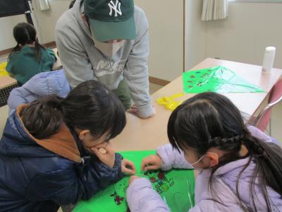 新年最初のわくわく教室は凧作りです。凧作り名人の丹羽講平先生に教えて頂きながらダイヤ型の凧を作りました。最初にビニールシートに思い思いの絵を描きました。今年の干支の辰やアニメのキャラクターなどそれぞれが思い思いの絵を描きました。その後、竹ひごで骨組みし、凧ひもを付けて完成させました。作った凧を早速、体育館や運動場で揚げました。あまり風が吹いていなかったですが、上手な子は凧糸が無くなるくらい高くは上げていました。あまり上がらなかった子も元気に走り周り、たこ揚げを楽しんでいました。
