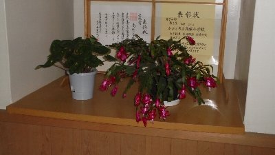 冬になり花の少ない季節になりました。校務士さんがかにサボテンを校内にかざってくれました。前の年からずーっと大切に育てていたものです。いっしょに、これも夏を過ごした去年のシクラメンをかざりました。こちらはまだつぼみが出始めで咲きそろってくれるか心配ですが、きっと今まで大事に育てられた分立派な花をつけてくれることでしょう。ボランティアの方が生けて下さる花も見ていてうれしくなります。
