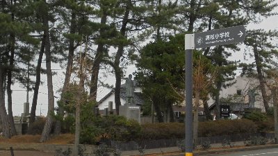 左の写真は、前庭から池越しに見る櫻井三郎左衛門の銅像です。木が茂っていてちょっと探すのに苦労しますね。(まるでウォーリーをさがせですね、答えは写真のど真ん中拡大してみて下さい 3枚目の写真が拡大したもの) 今までさして関心を見せなかった子どもたちが、登下校の時しげしげと銅像をみている様子も見受けられます。 こうやって地域のことに見直し学習を進めた高小の1年でした。来年も地域の方々に助けられ、共に子どもたちの健全育成に取り組んでいきます。