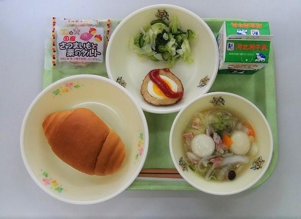 バターロール スコッチエッグ えだまめサラダ しらたまスープ さつまいもとくりのタルト 牛乳